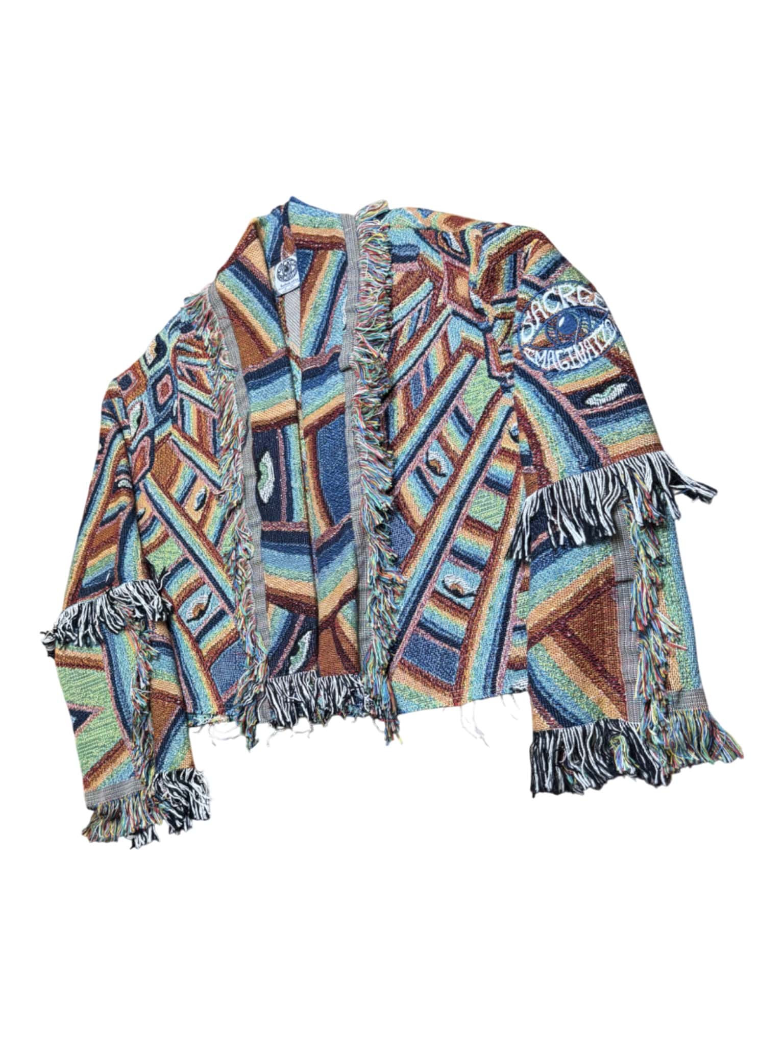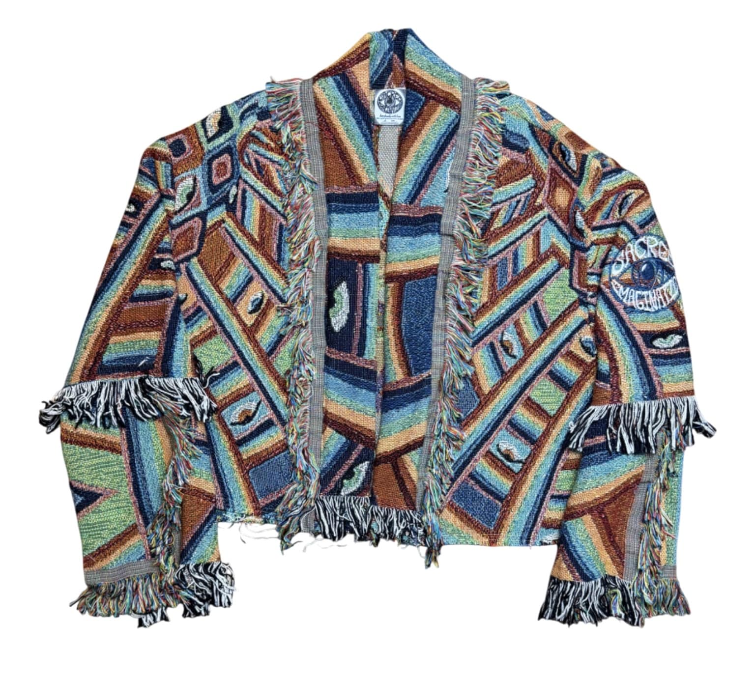 One of a kind garment, made from a woven blanket based off the digital painting 'All Knowing' by visionary artist Electrica Designs. The blankets are woven in the US using 100% USA grown cotton. Each piece is cut individually for a unique flair on sleeve patchwork.