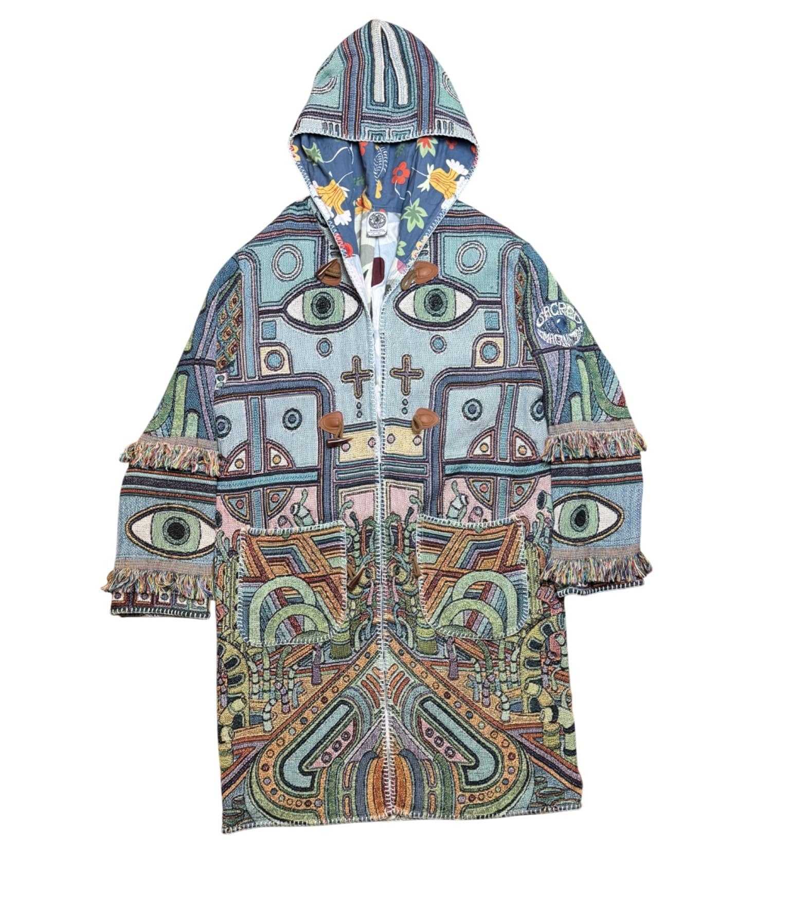 One of a kind garment, made from a woven blanket based off the painting 'Cactus Man' by visionary artist Harry Pack. The blankets are woven in the US using 100% USA grown cotton. Each piece is cut individually for a unique flair on sleeve patchwork. Lined with bed sheets