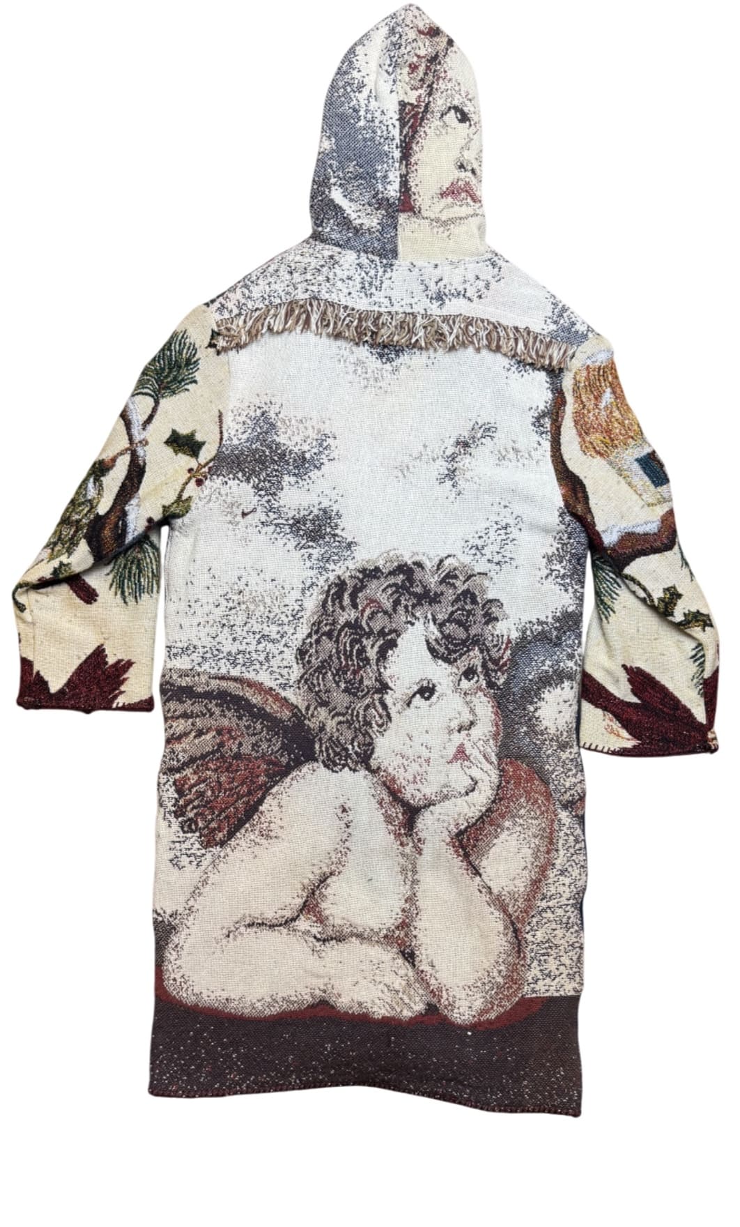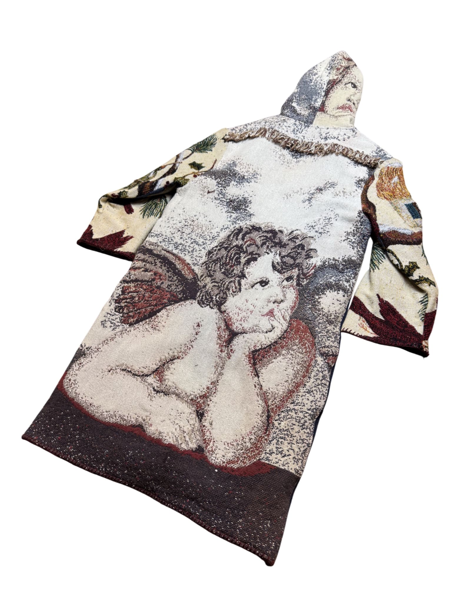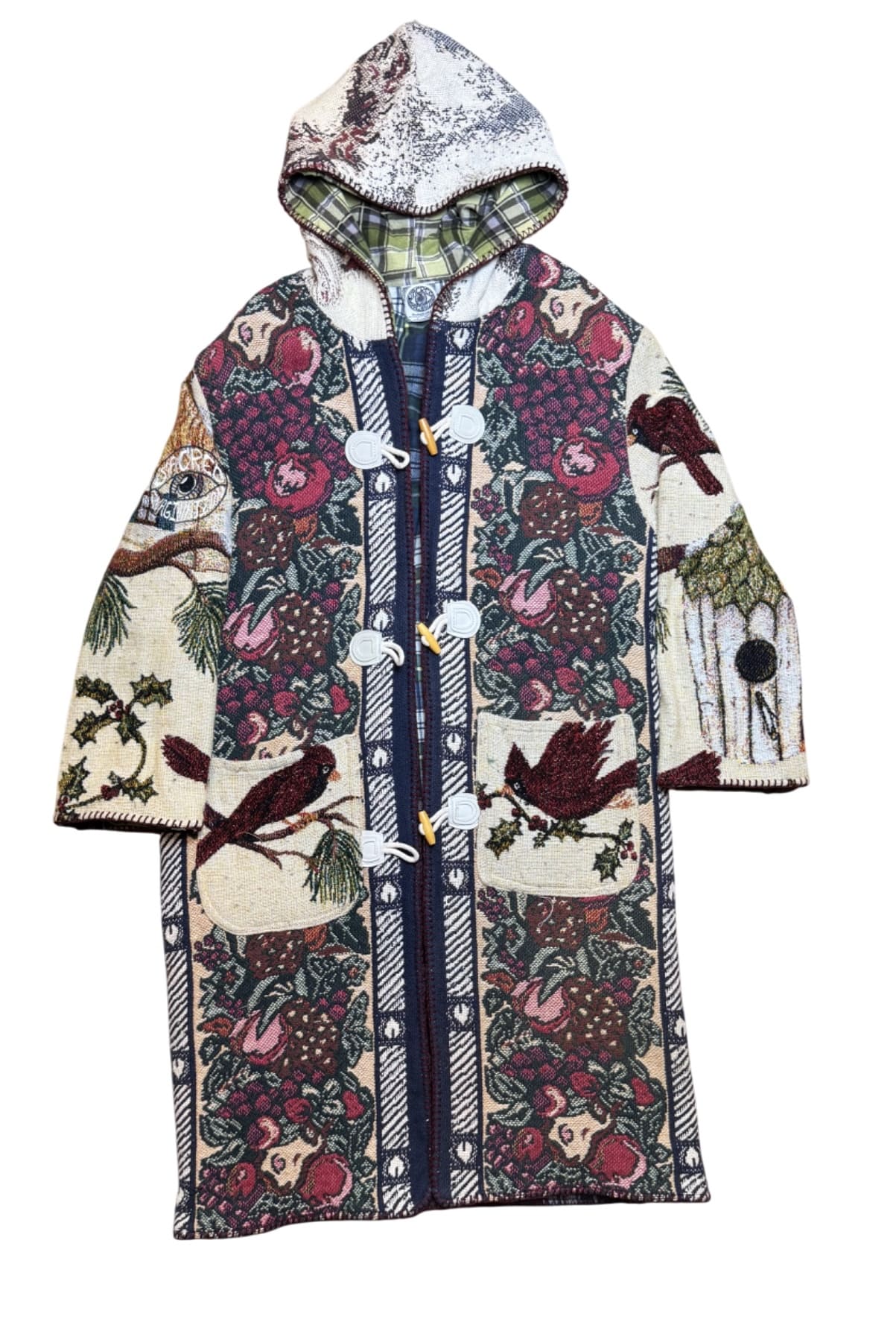 One of a kind garment, made from two thrifted blankets. Lined with bed sheets.