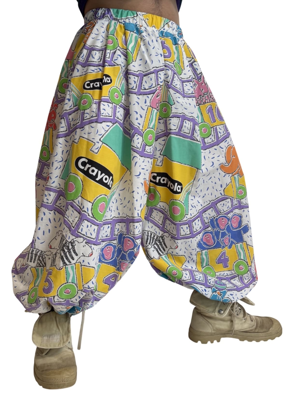 One of a kind pants, made from thrifted bed sheets. Elastic waistband and drawstring can cinch waist to size 24 and will stretch up to 40. Cinched bottom can be lifted up for huge shorts, or sit at ankle for flowy, baggy pants.