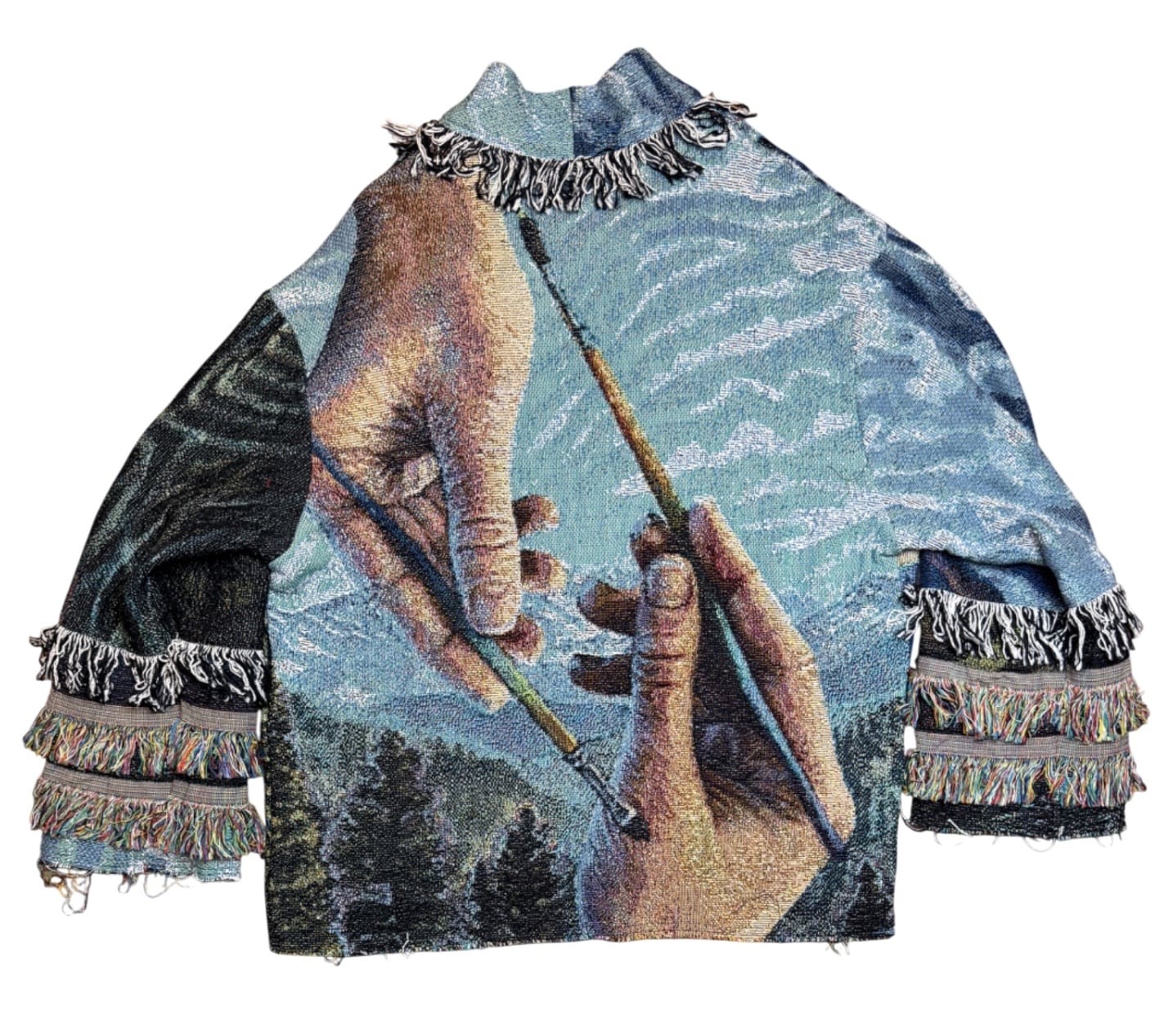 One of a kind garment, made from a woven blanket based off the painting 'Creation' by visionary artist Morgan Mandala. The blankets are woven in the US using 100% USA grown cotton. Each piece is cut individually for a unique flair on sleeve patchwork.