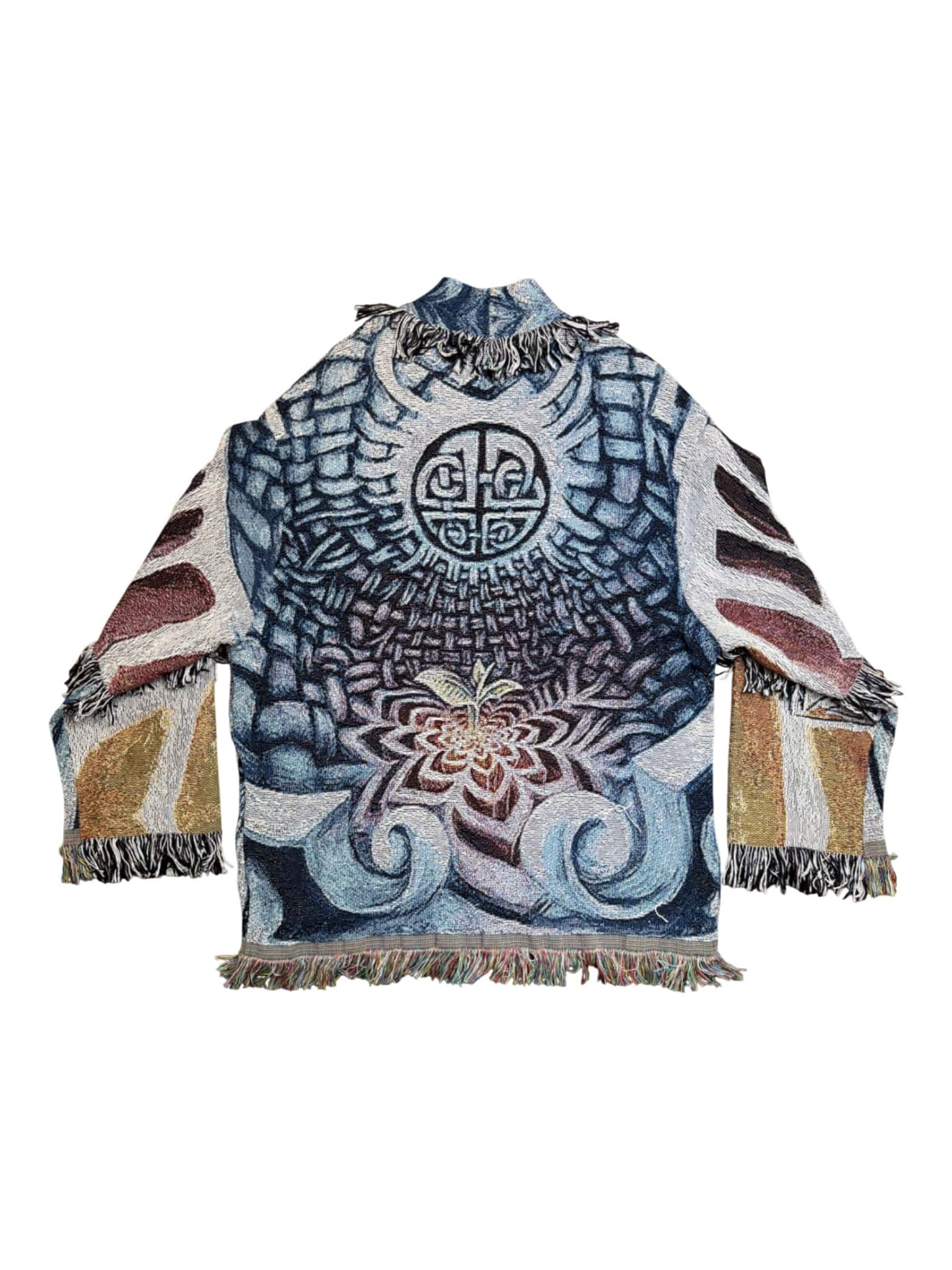 One of a kind garment, made from a woven blanket based off the painting 'Dara' by visionary artist Lanikai. The blankets are woven in the US using 100% USA grown cotton. Each piece is cut individually for a unique flair on sleeve patchwork.