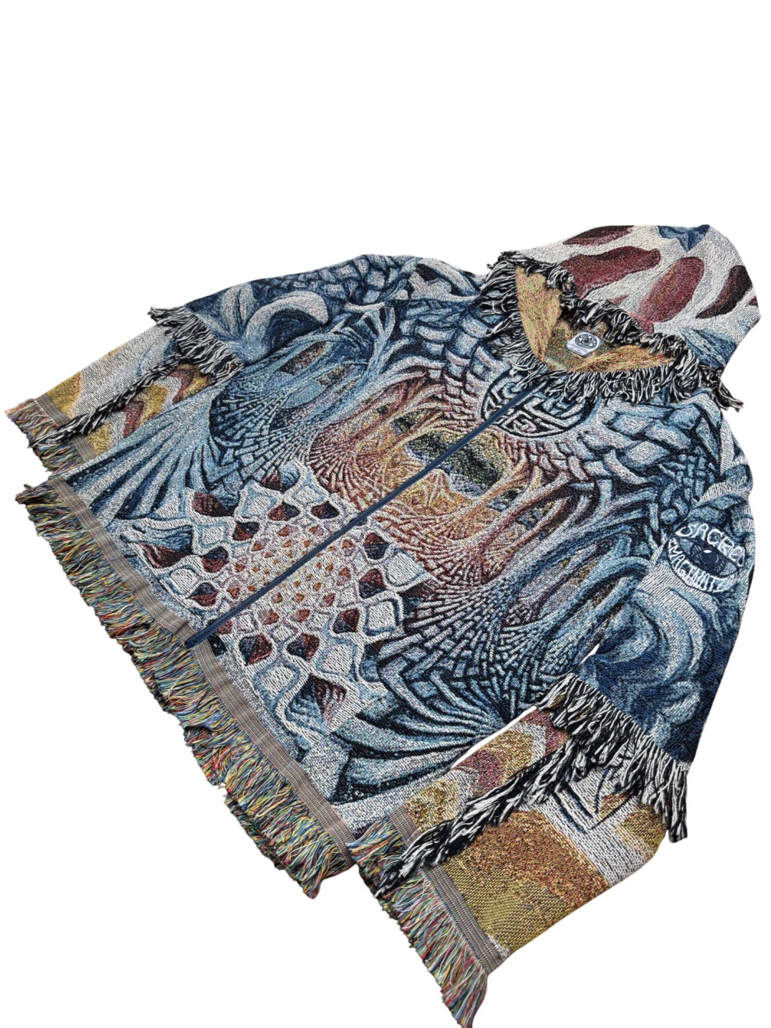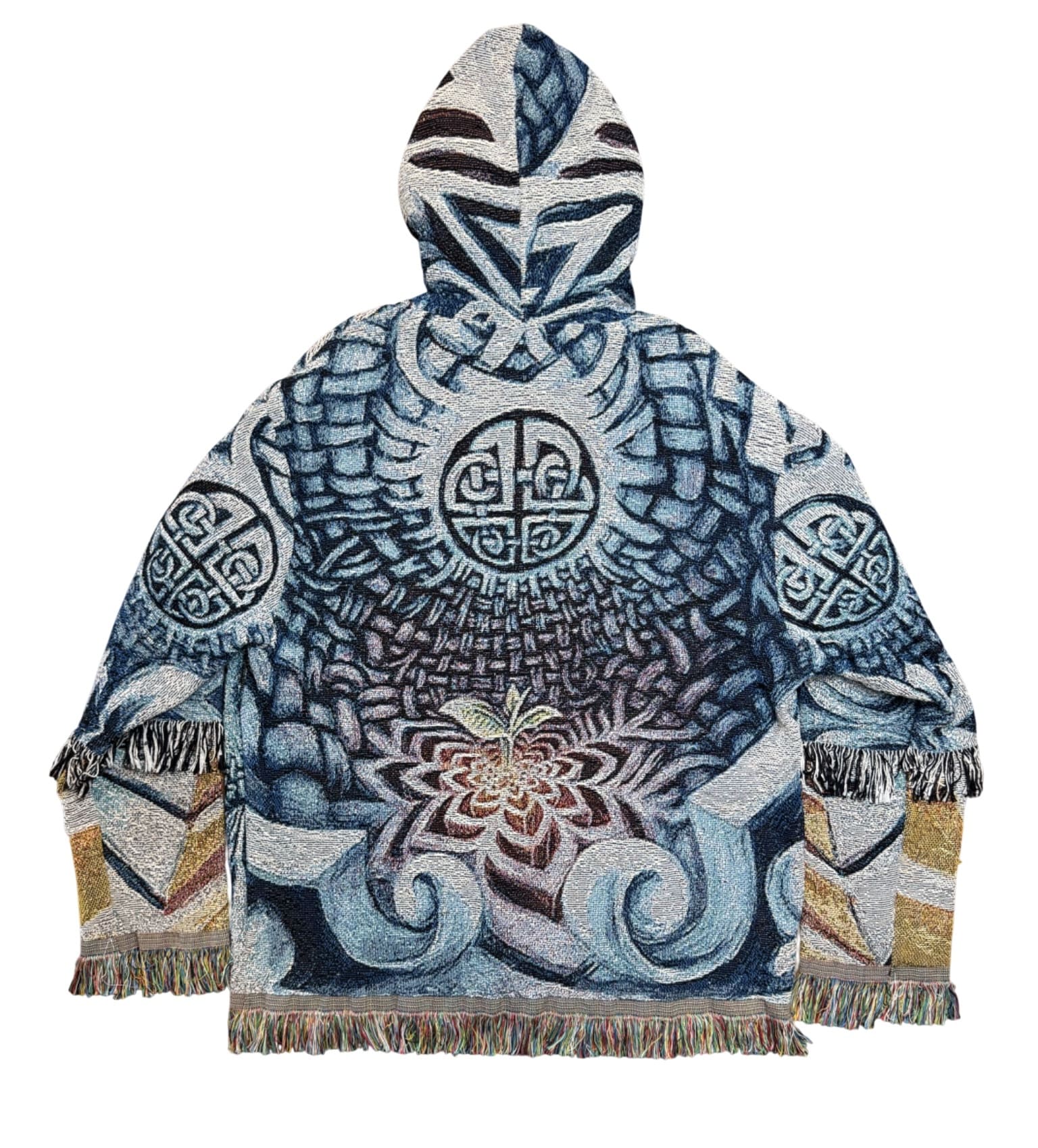 One of a kind garment, made from a woven blanket based off the painting 'Dara' by visionary artist Lanikai. The blankets are woven in the US using 100% USA grown cotton. Each piece is cut individually for a unique flair on sleeve patchwork.