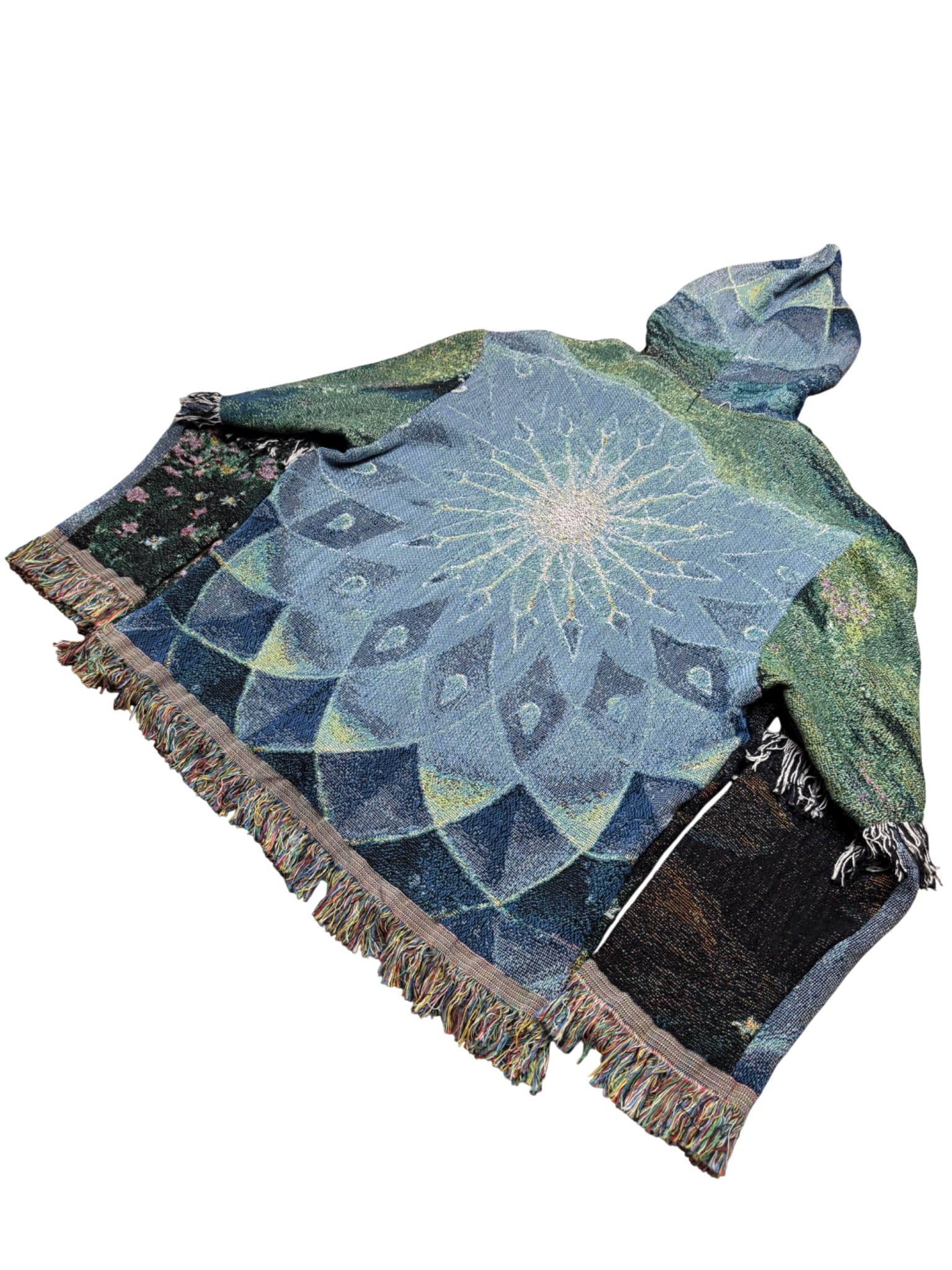 One of a kind garment, made from a woven blanket based off the painting 'Euphoric Earth' by visionary artist Morgan Mandala. The blankets are woven in the US using 100% USA grown cotton. Each piece is cut individually for a unique flair on sleeve patchwork.