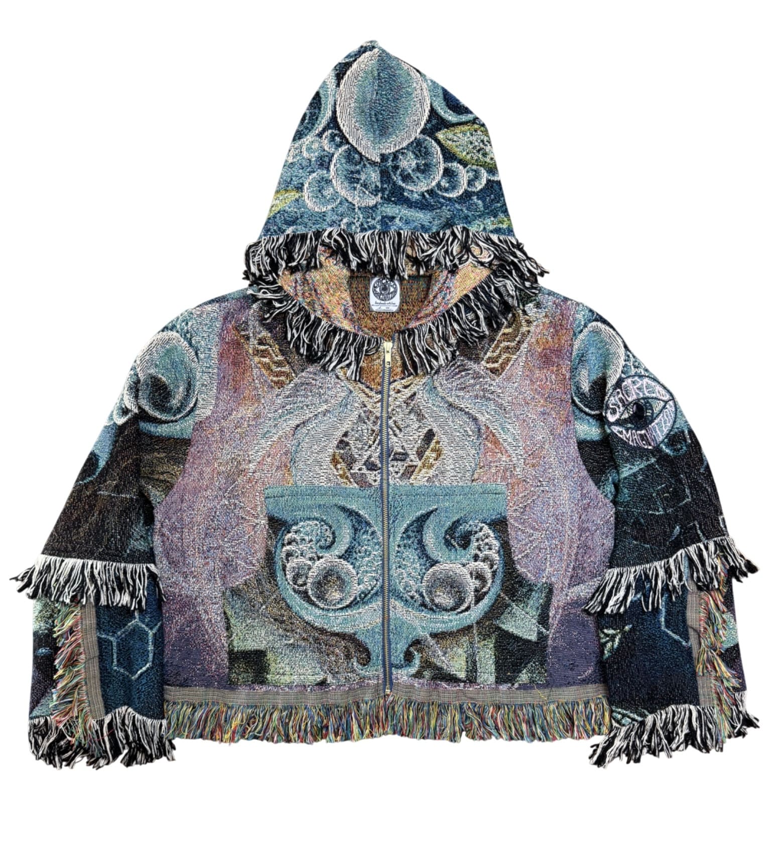 One of a kind garment, made from a woven blanket based off the painting 'Flowing as One' by visionary artist Krystleyez. The blankets are woven in the US using 100% USA grown cotton. Each piece is cut individually for a unique flair on sleeve patchwork.