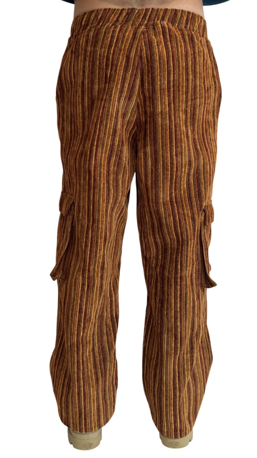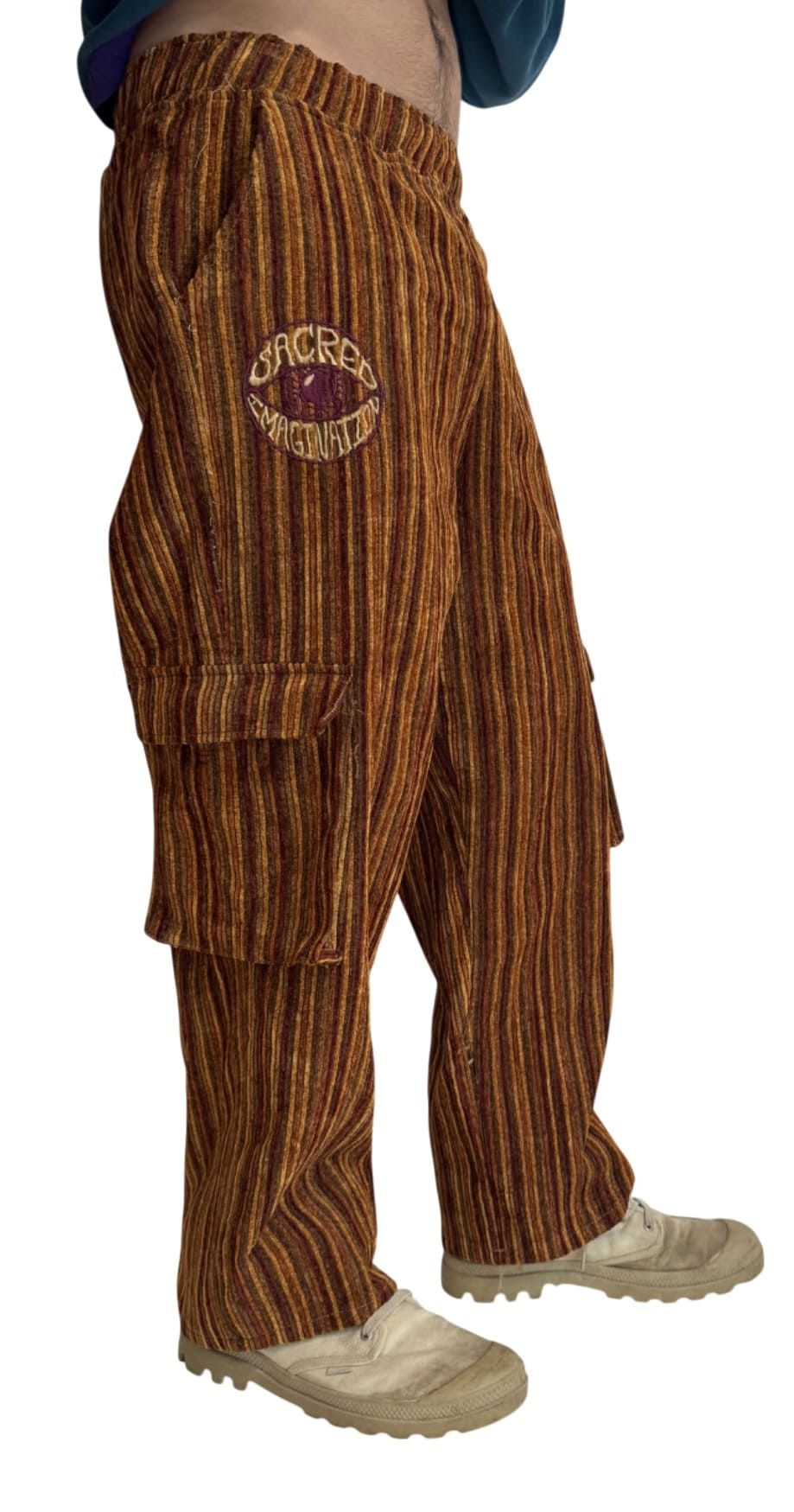 One of a kind pants, made from vintage upholstery. Elastic waistband and drawstring can cinch waist to size 26 and will stretch up to 36. 2 cargo pockets