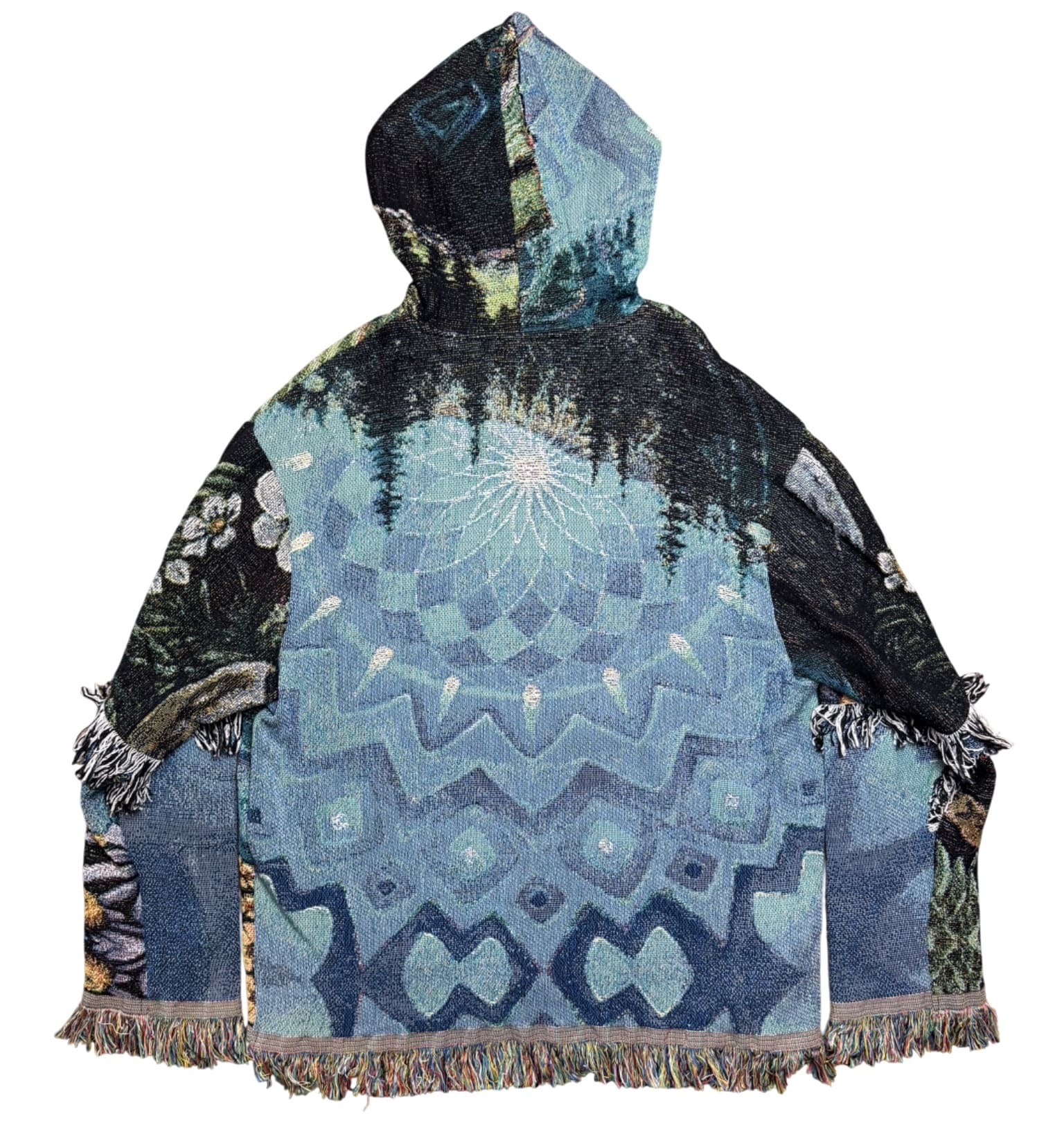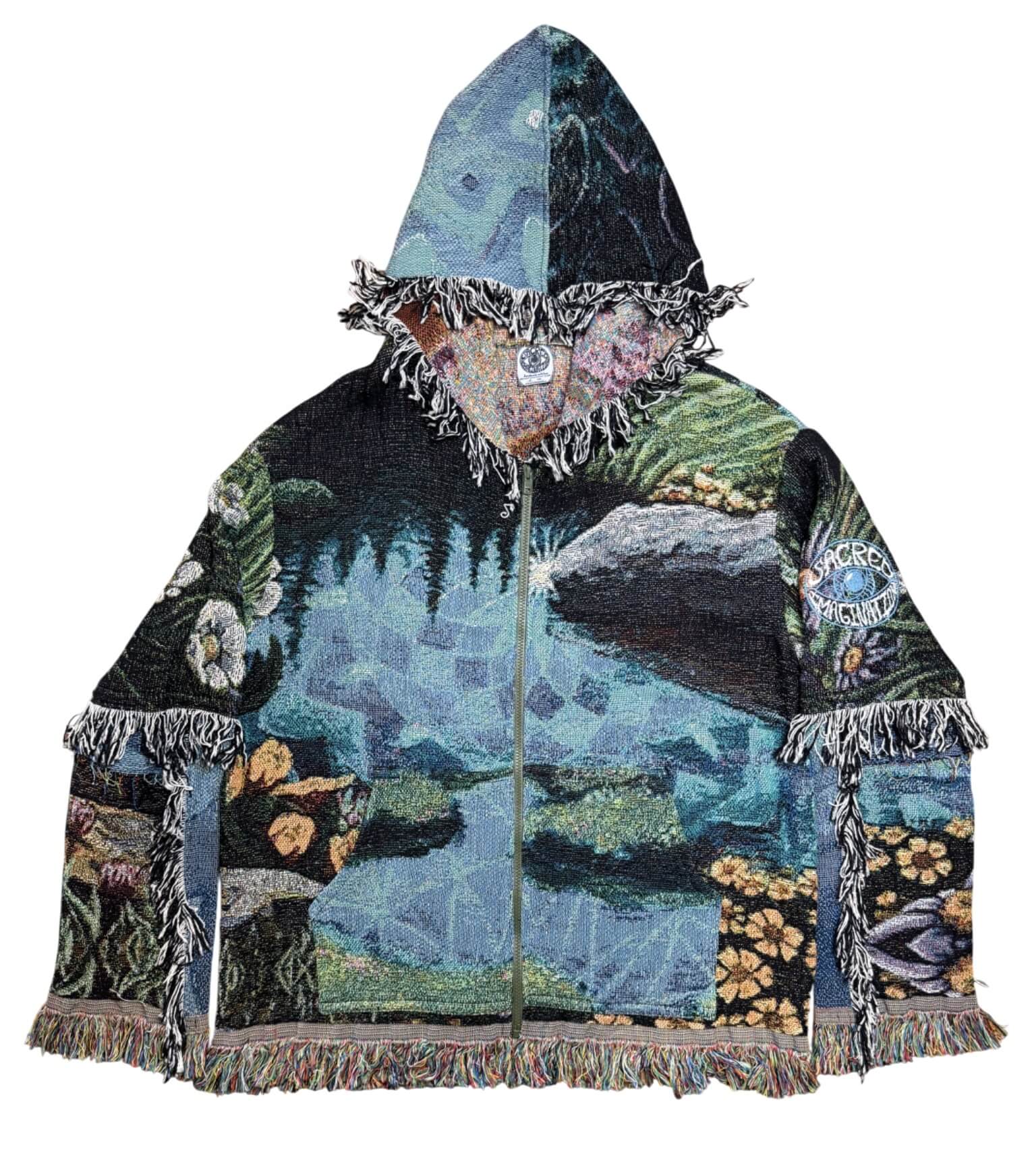 One of a kind garment, made from a woven blanket based off the painting 'In Full Bloom' by visionary artist Morgan Mandala. The blankets are woven in the US using 100% USA grown cotton. Each piece is cut individually for a unique flair on sleeve patchwork.