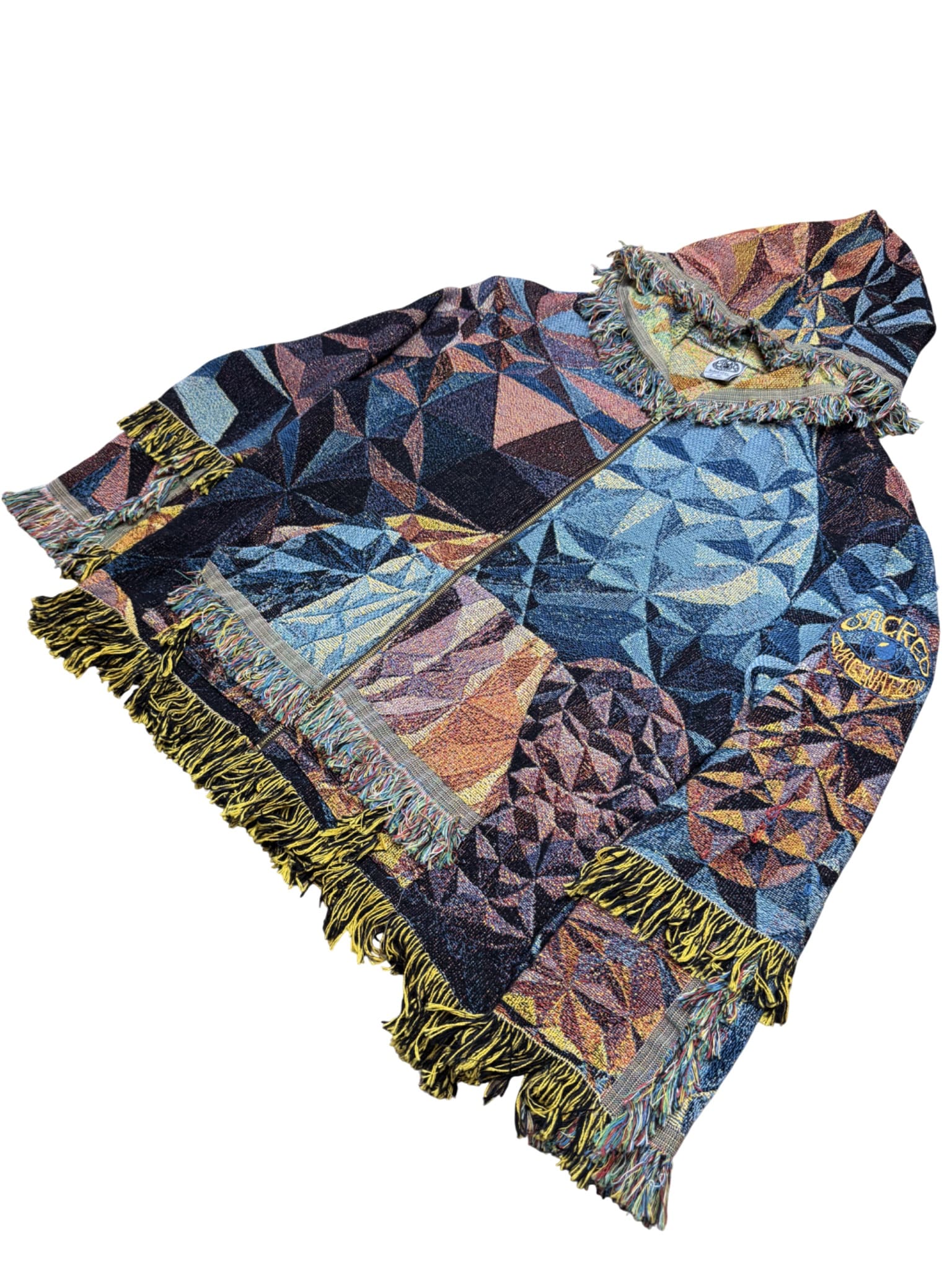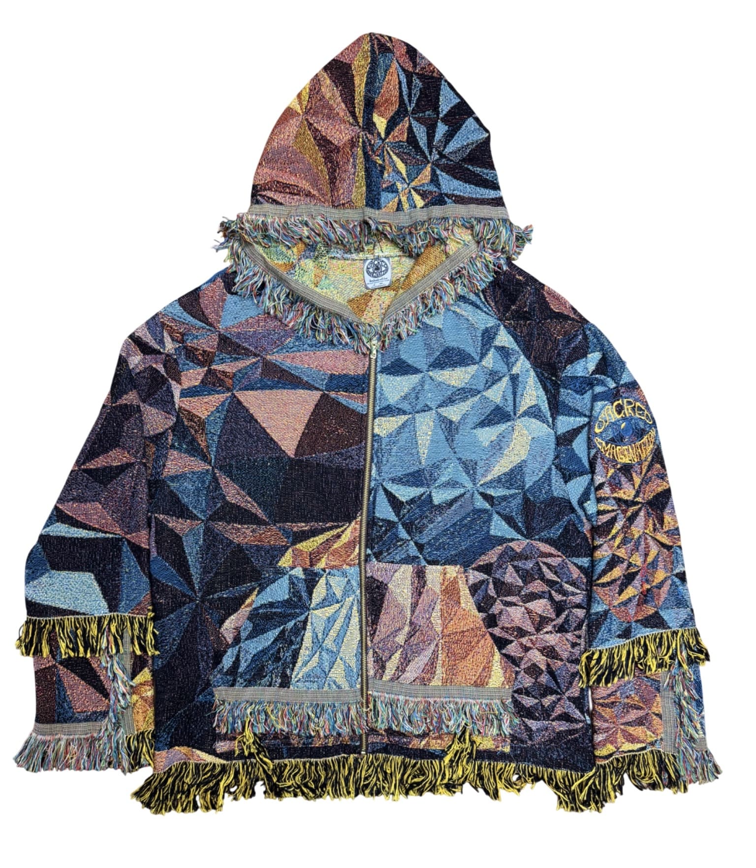 One of a kind garment, made from a woven blanket based off the painting 'Jellyfish' by visionary artist Z (the first zedist). The blankets are woven in the US using 100% USA grown cotton. Each piece is cut individually for a unique flair on sleeve patchwork.