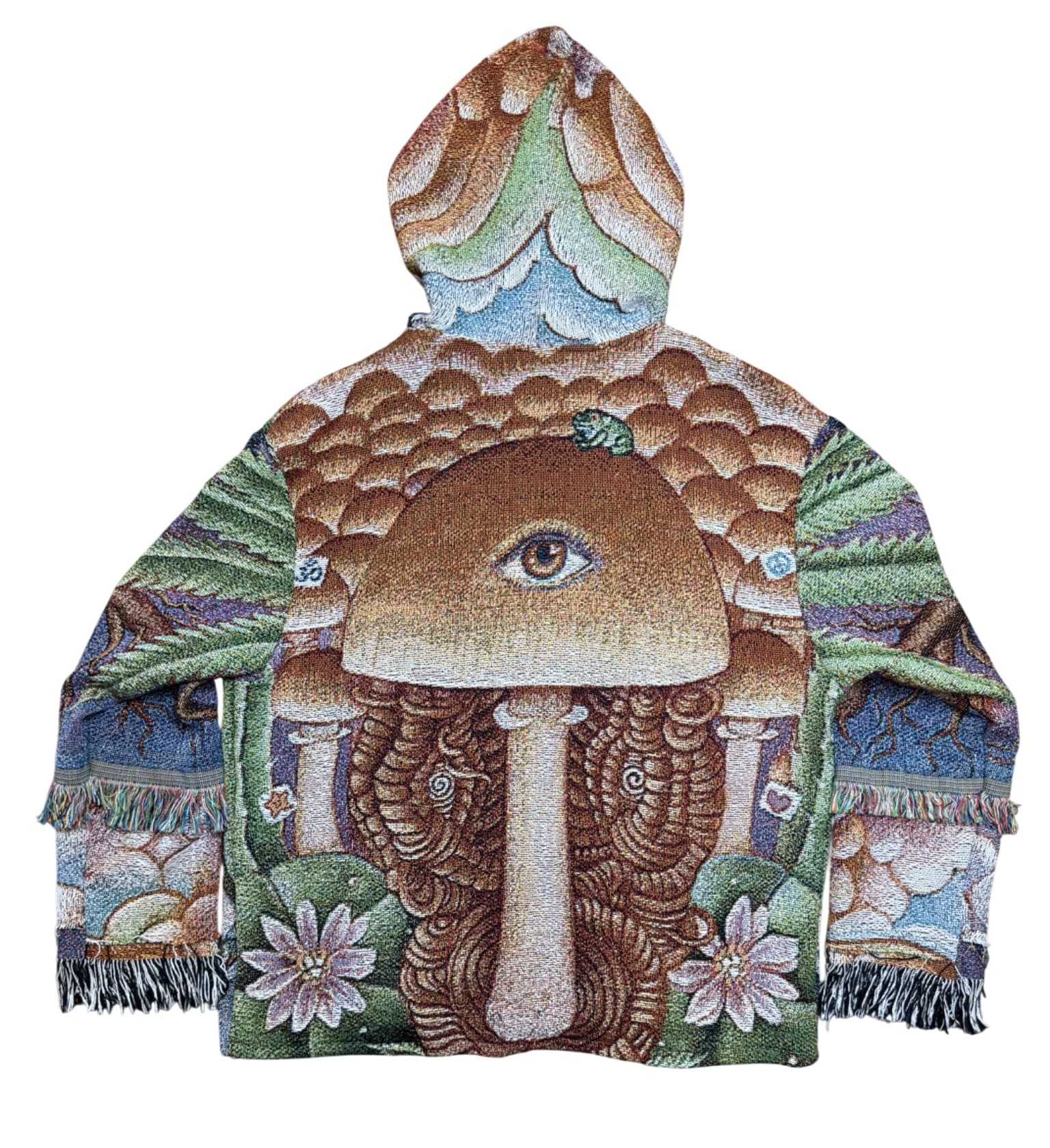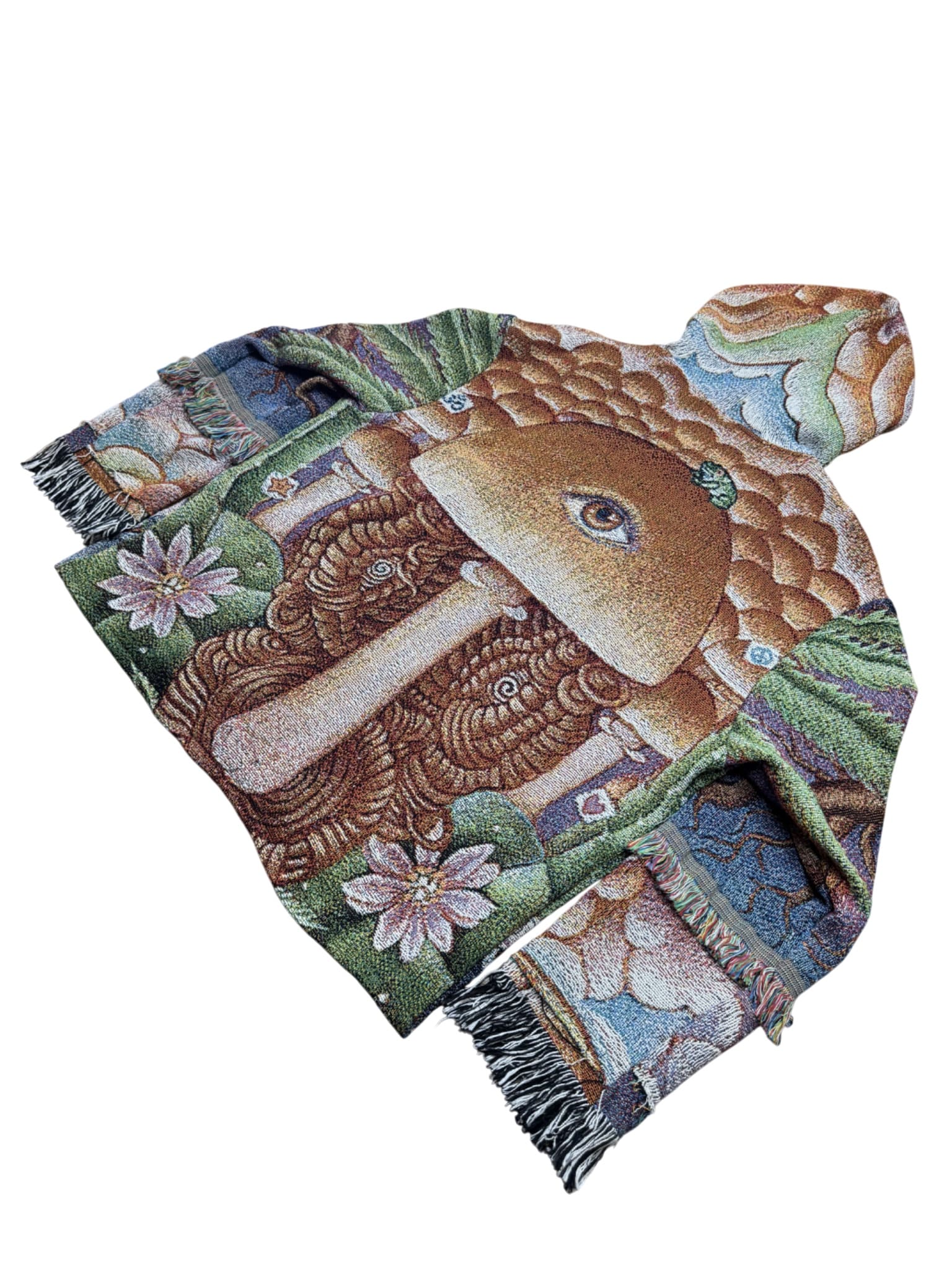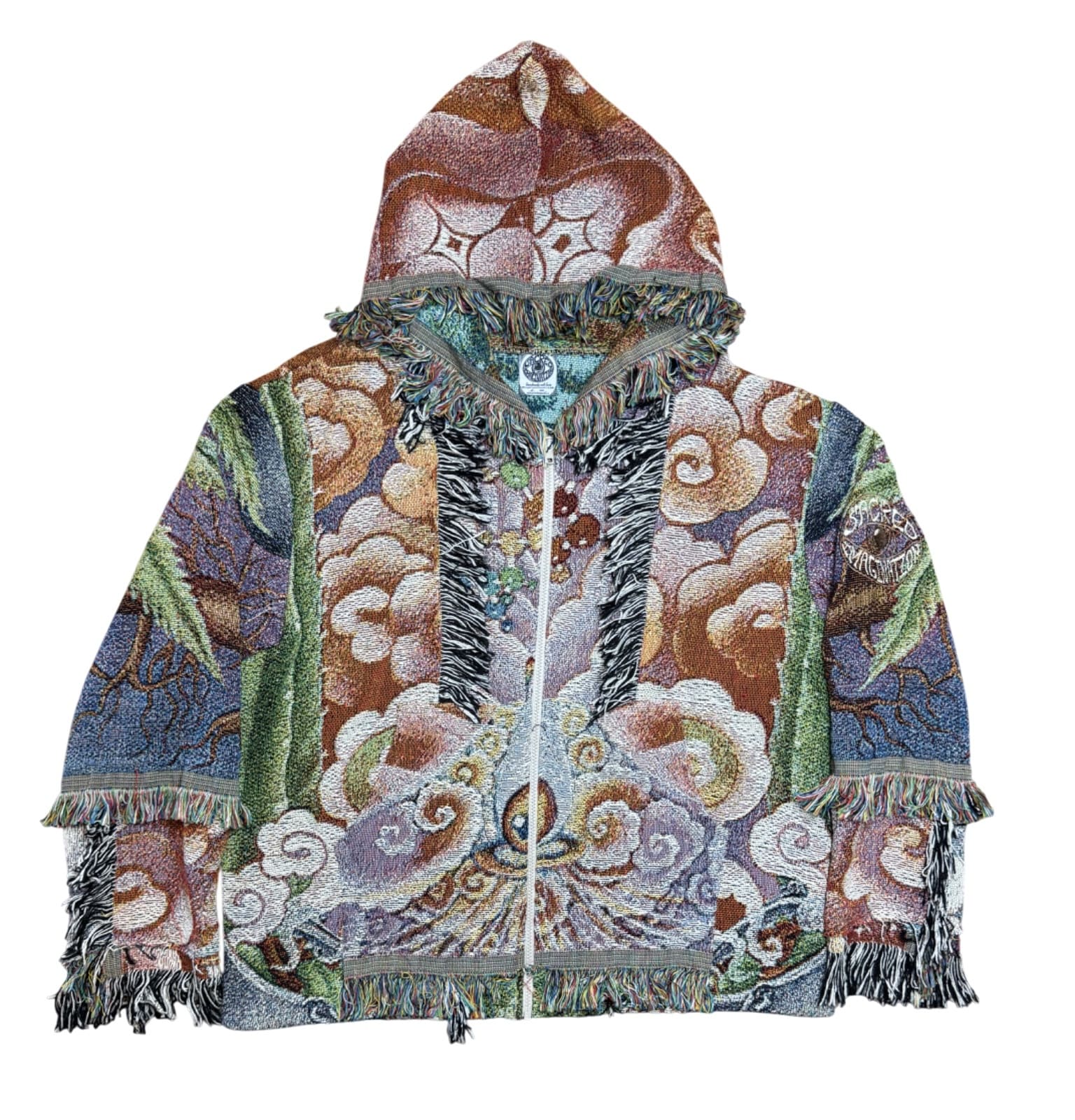 One of a kind garment, made from a woven blanket based off the painting 'Mind Medicine' by visionary artist Stella Stryzowska. The blankets are woven in the US using 100% USA grown cotton. Each piece is cut individually for a unique flair on sleeve patchwork.