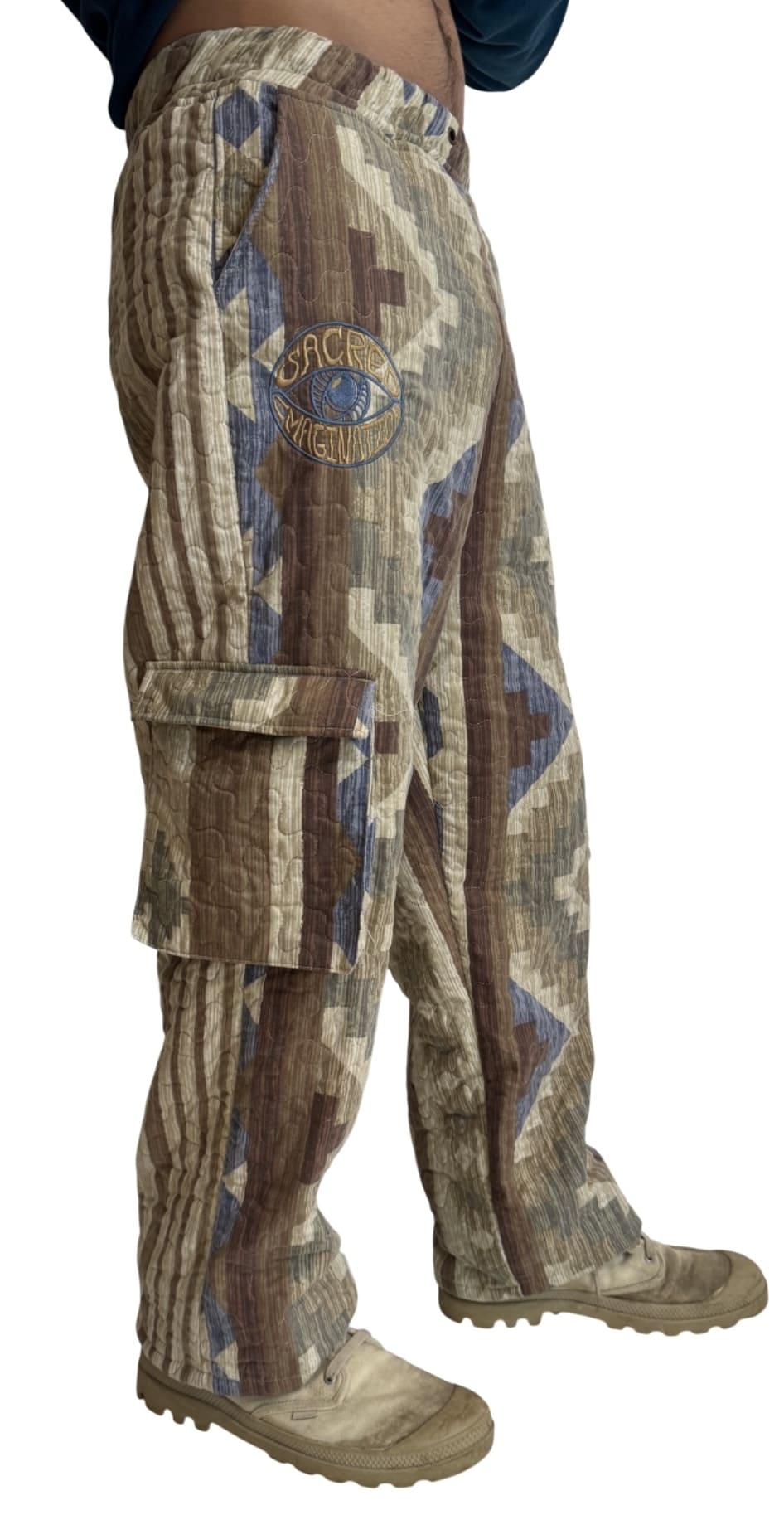 One of a kind pants, made from a thrifted quilt. Elastic waistband and drawstring can cinch waist to size 26 and will stretch up to 36. 2 cargo pockets