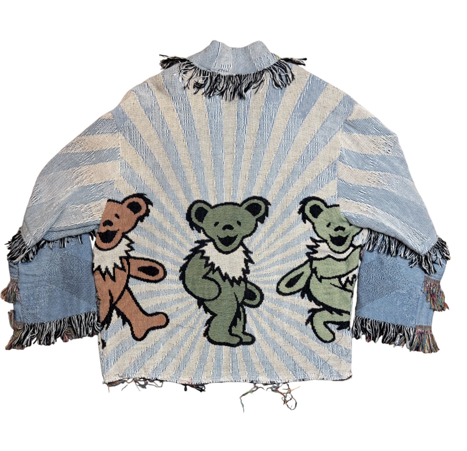 One of a kind garment, made from an officially licensed Grateful Dead woven blanket from the Little Hippie. The blankets are woven in the US using 100% USA grown cotton. Each piece is cut individually for a unique flair on sleeve patchwork.