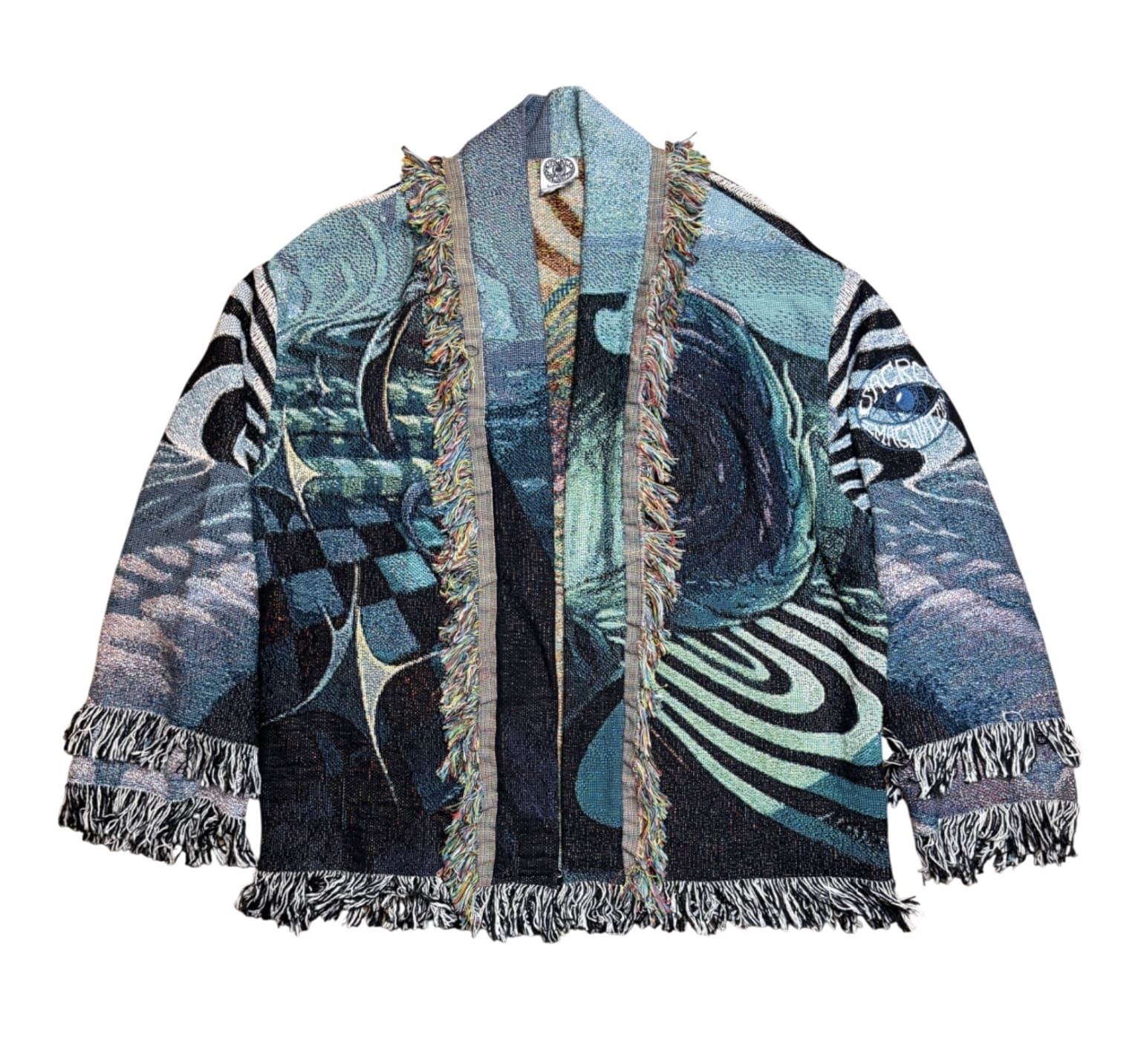 One of a kind garment, made from a woven blanket based off the painting 'Pleroma' by visionary artist Andrew Norris. The blankets are woven in the US using 100% USA grown cotton. Each piece is cut individually for a unique flair on sleeve patchwork.