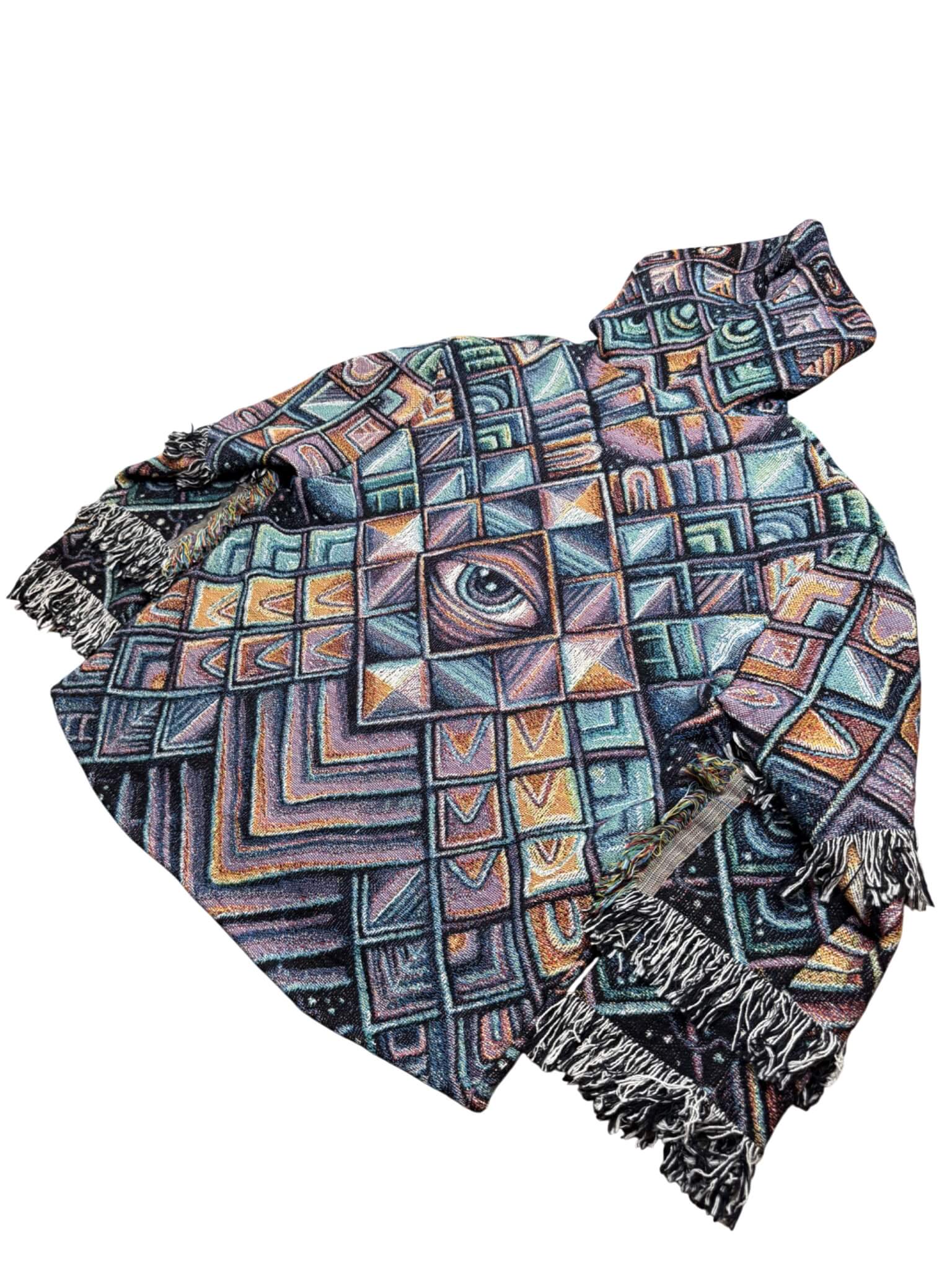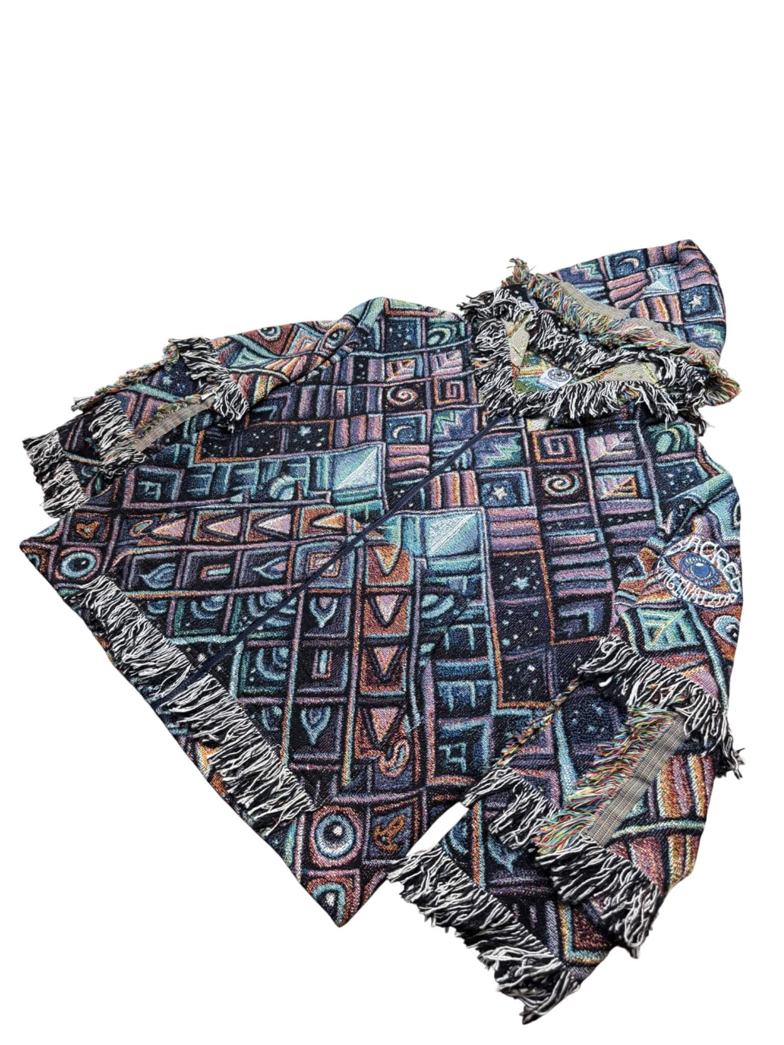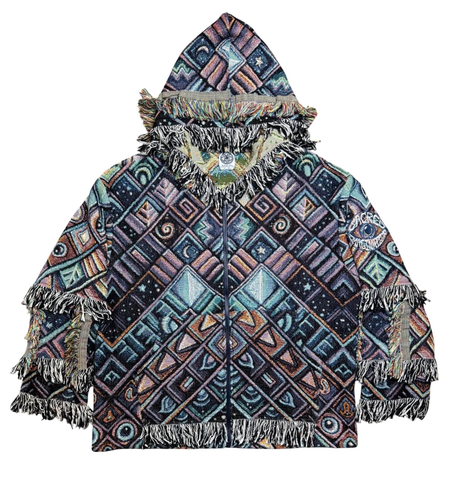 One of a kind garment, made from a woven blanket based off the painting 'Rising Sun' by visionary artist John Speaker. The blankets are woven in the US using 100% USA grown cotton. Each piece is cut individually for a unique flair on sleeve patchwork.