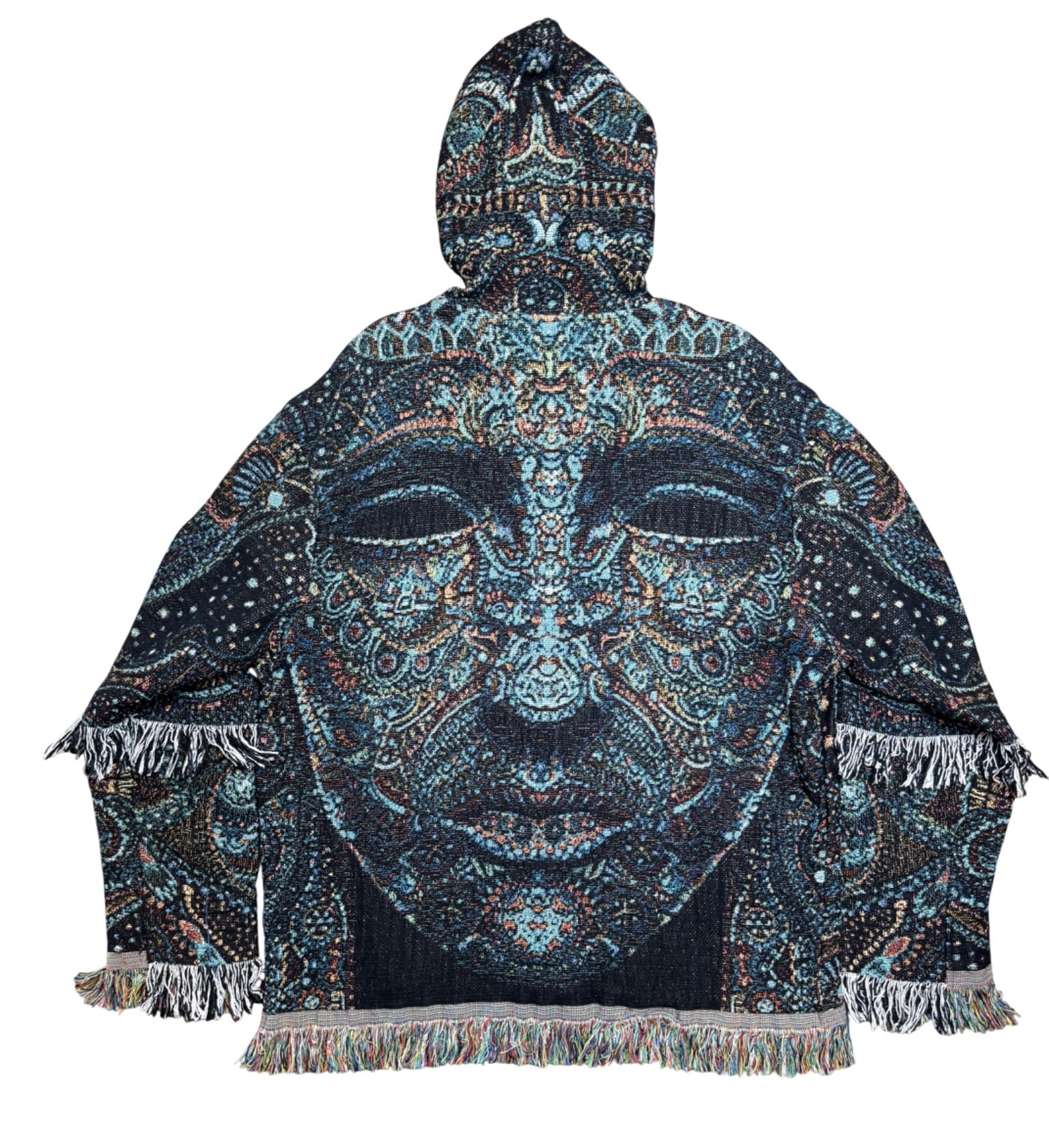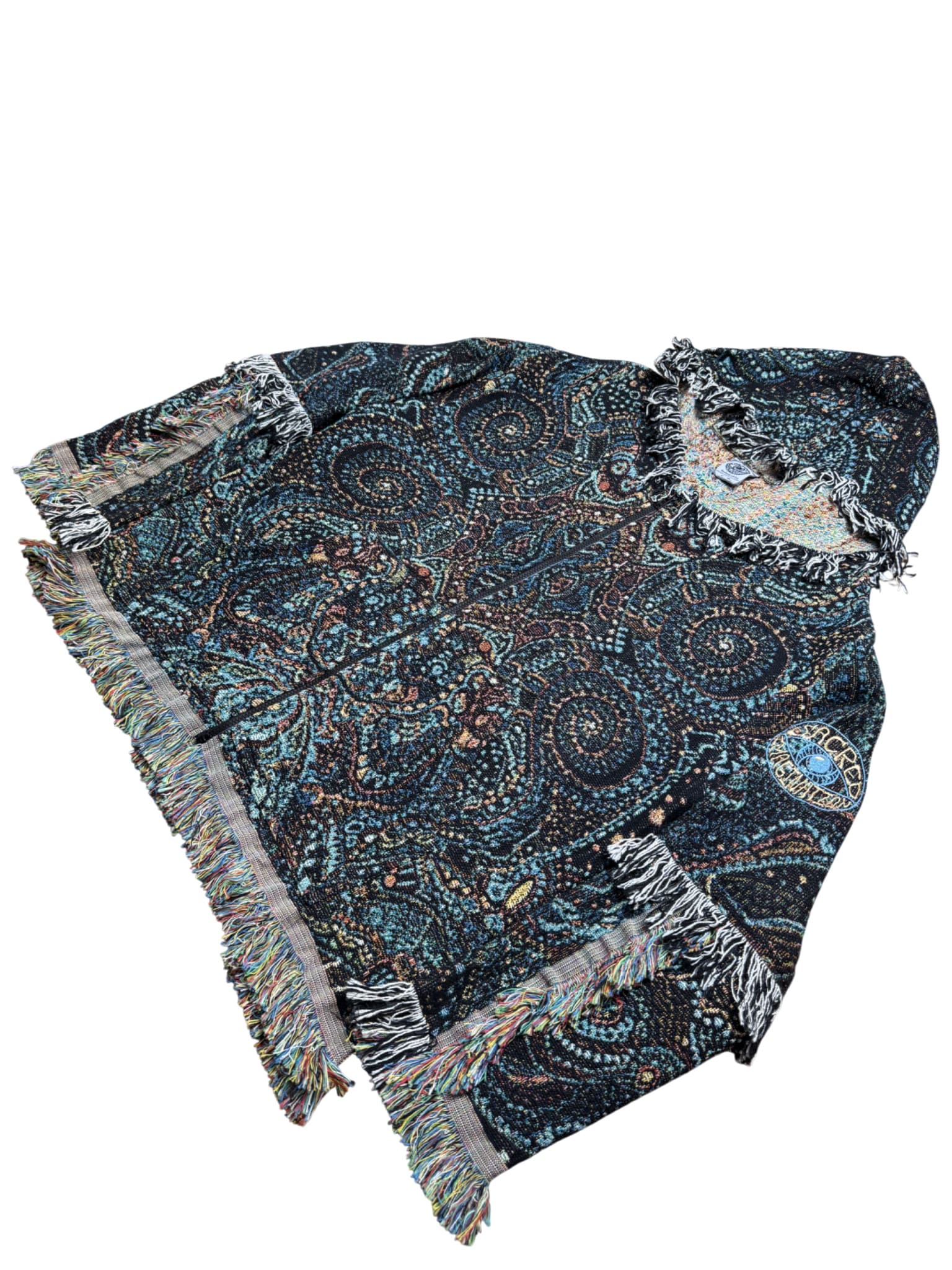 One of a kind garment, made from a woven blanket based off the painting 'Sirian' by visionary artist. The blankets are woven in the US using 100% USA grown cotton. Each piece is cut individually for a unique flair on sleeve patchwork.