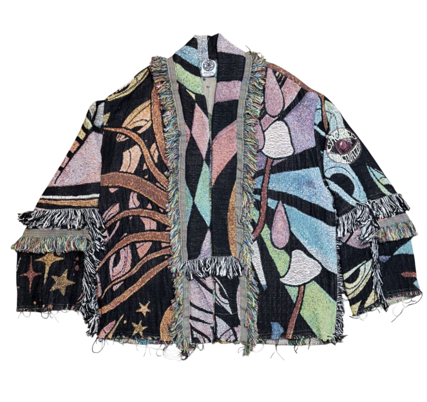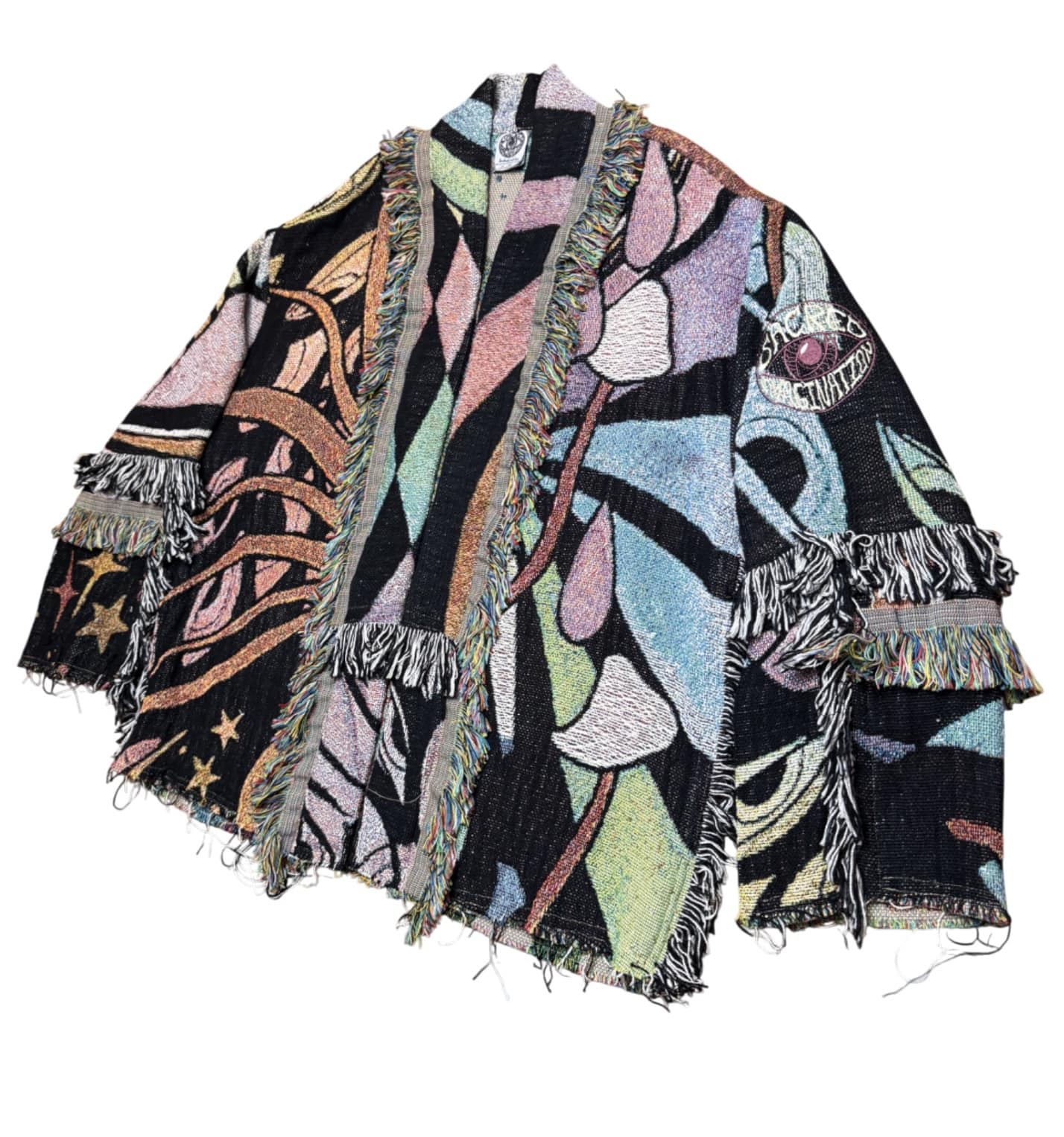 One of a kind garment, made from a woven blanket based off the painting 'Soulstice' by visionary artist Patakota. The blankets are woven in the US using 100% USA grown cotton. Each piece is cut individually for a unique flair on sleeve patchwork.
