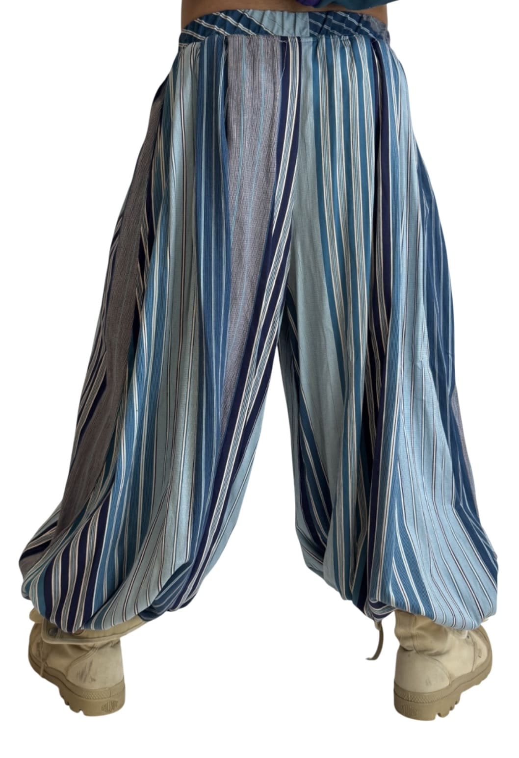 One of a kind pants, made from thrifted bed sheets. Elastic waistband and drawstring can cinch waist to size 24 and will stretch up to 40. Cinched bottom can be lifted up for huge shorts, or sit at ankle for flowy, baggy pants.