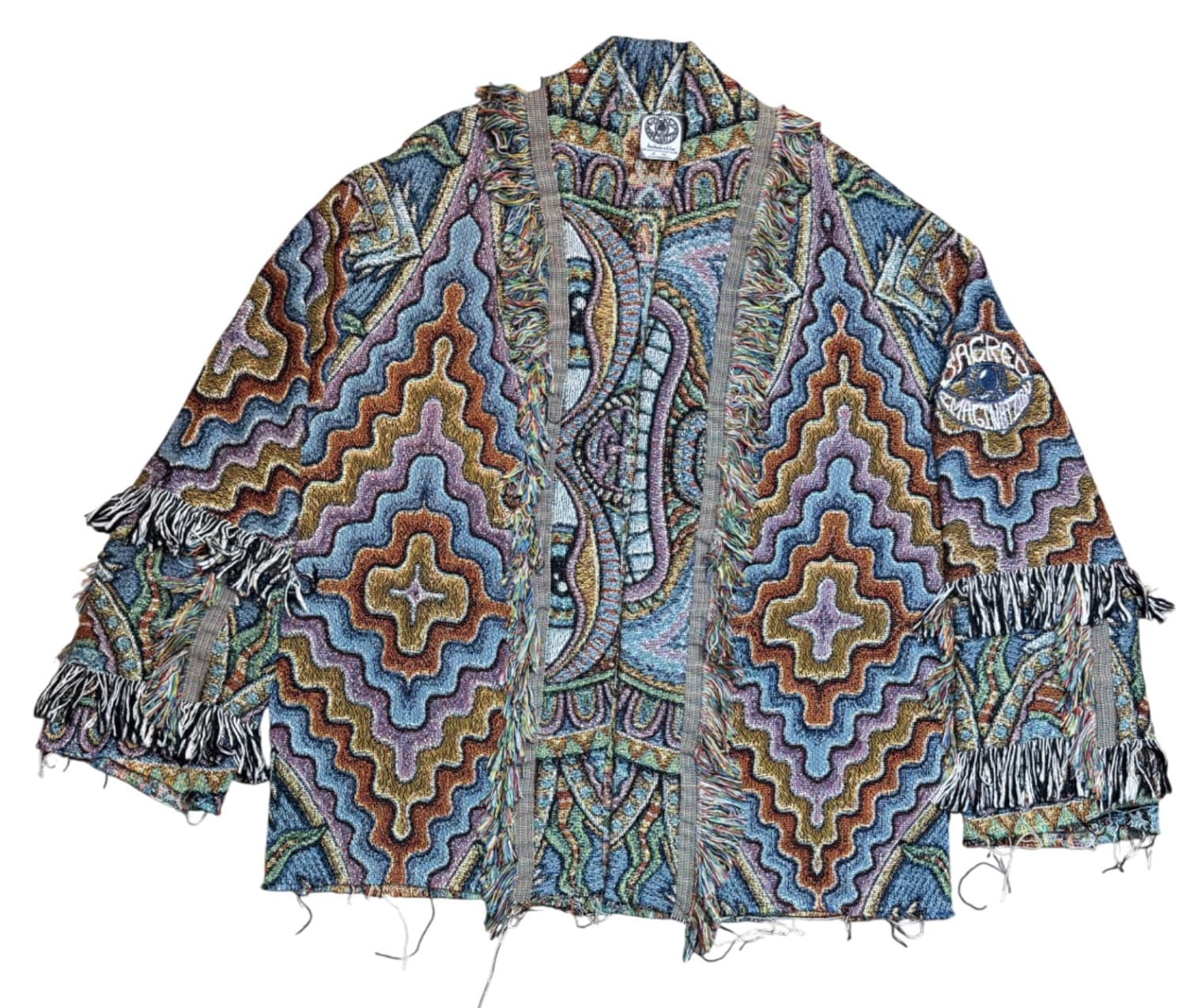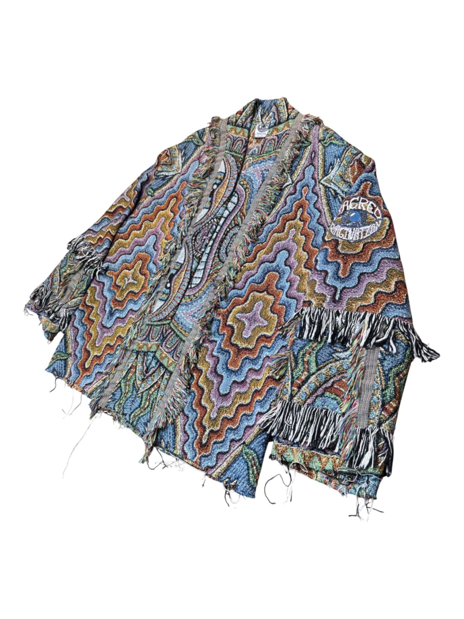 One of a kind garment, made from a woven blanket based off the painting 'Taita Inti' by visionary artist Chris Dyer. The blankets are woven in the US using 100% USA grown cotton. Each piece is cut individually for a unique flair on sleeve patchwork.