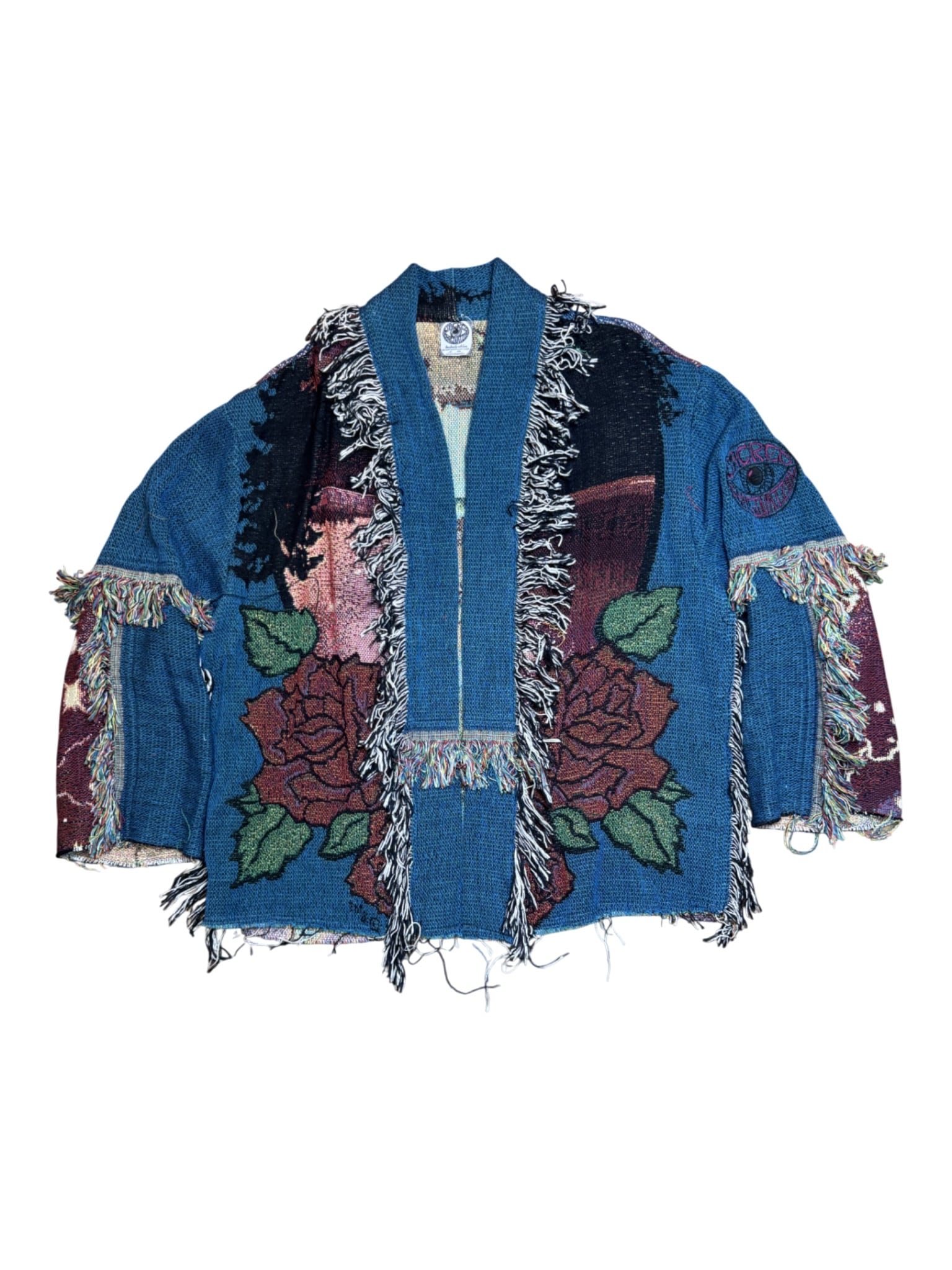 One of a kind garment, made from an officially licensed Grateful Dead woven blanket designed by the Little Hippie. The blankets are woven in the US using 100% USA grown cotton. Each piece is cut individually for a unique flair on sleeve patchwork.
