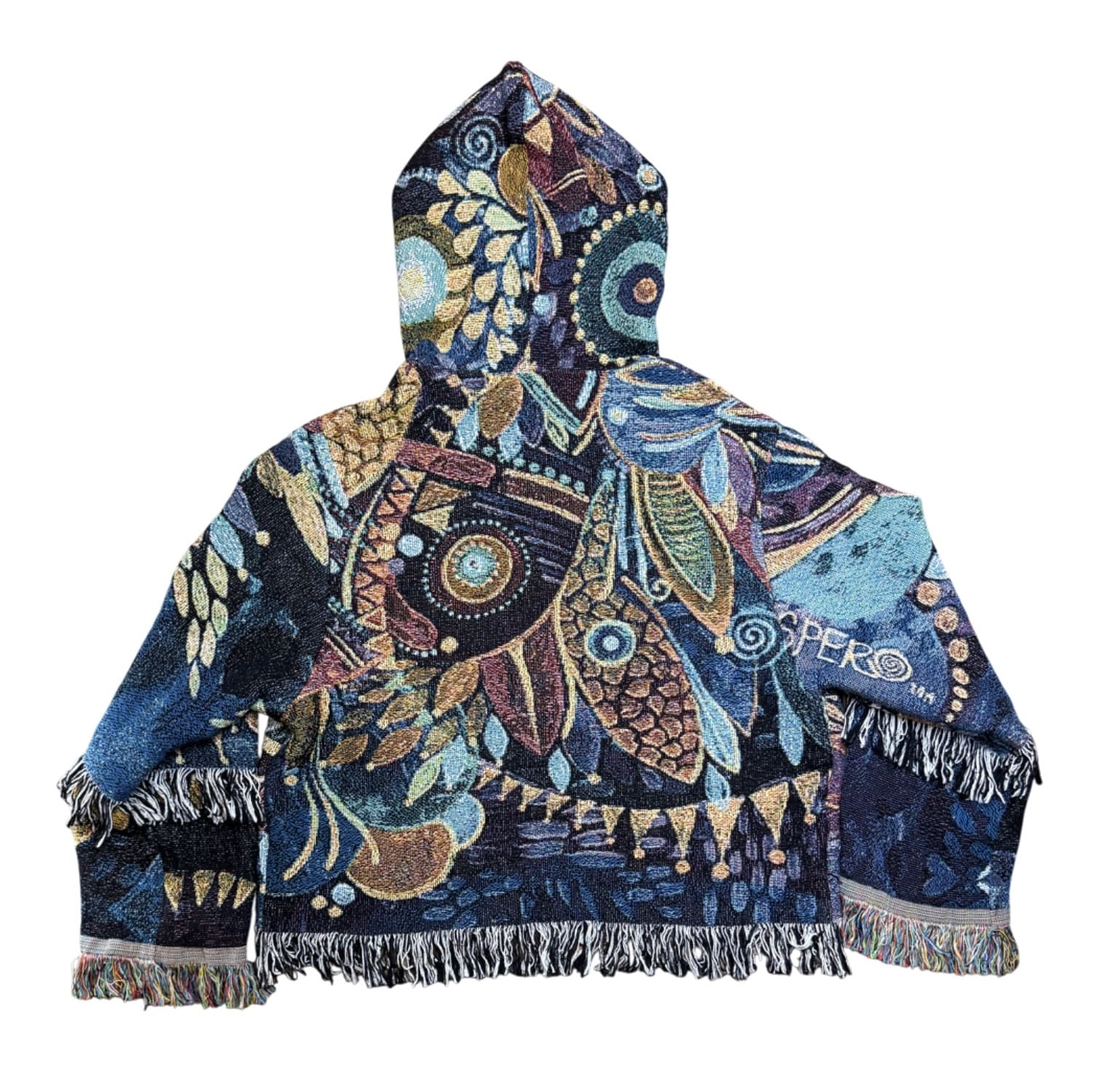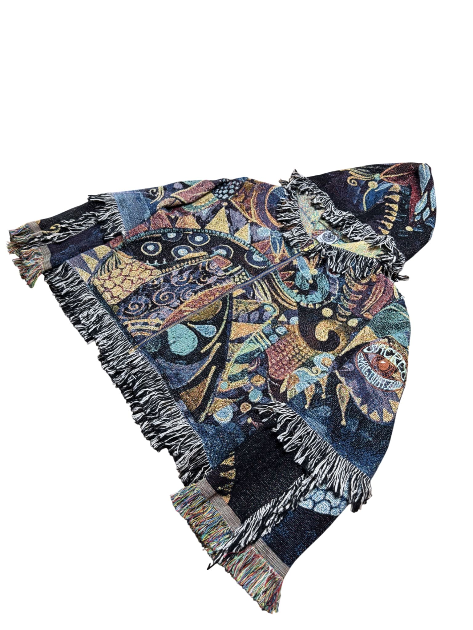 One of a kind garment, made from a woven blanket based off the painting 'Unzippered' by visionary artist Spero. The blankets are woven in the US using 100% USA grown cotton. Each piece is cut individually for a unique flair on sleeve patchwork.