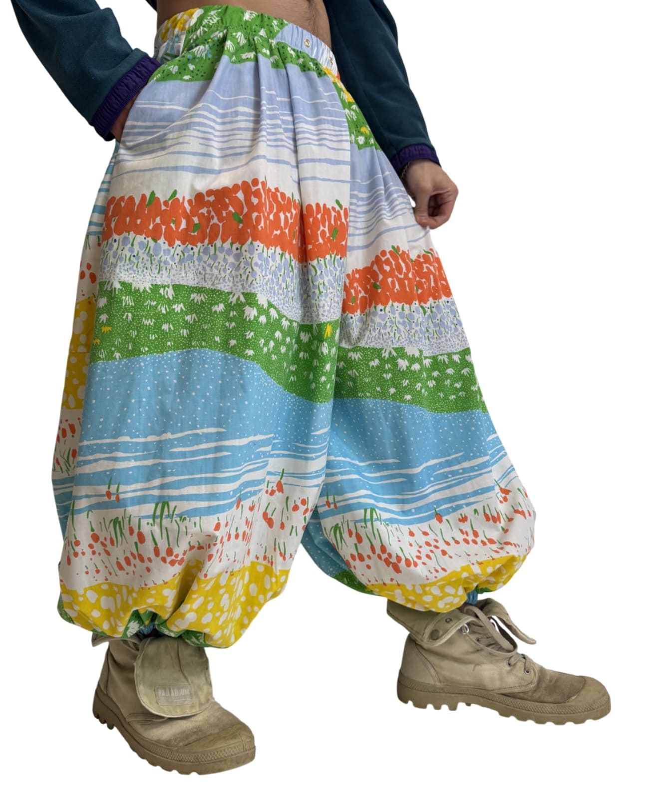 One of a kind pants, made from thrifted bed sheets. Elastic waistband and drawstring can cinch waist to size 24 and will stretch up to 40. Cinched bottom can be lifted up for huge shorts, or sit at ankle for flowy, baggy pants.